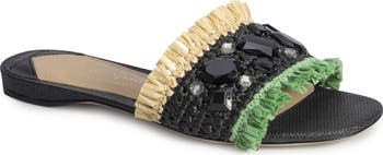 Woven raffia, mixed crystals and colorful fringe bring a whimsical collision of textures to this statement slide sandal built on a slim, flexible footbed.