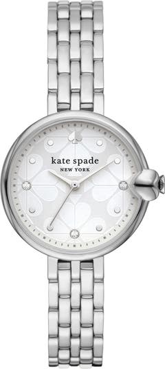 Spade clovers and sparkling CZ stones style the three-hand dial of a elegant watch secured with a slim stainless steel bracelet.