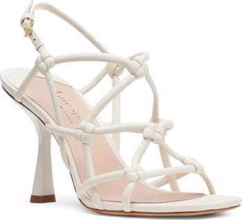 Tubular straps and knotted accents create a cage-inspired silhouette on a slingback leather sandal balanced by a square toe and flare heel.