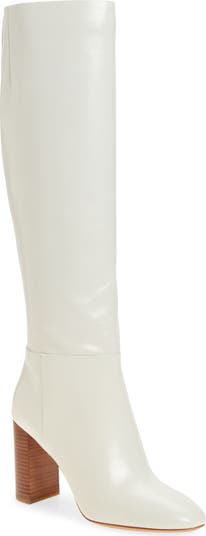 A logo-embossed back pull tab puts a signature stamp on a streamlined knee-high boot crafted from smooth leather and lifted by a stacked block heel.