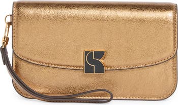 A crinkled texture adds to the shimmer of a metallic leather wallet that comes with an optional wristlet strap for versatile carry.
