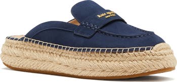 A suede loafer mule is further hybridized with a woven, espadrille-style platform sole and signed off with gleaming logo hardware on the top strap.