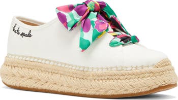 Vibrant, orchid-print laces lend signature charm to this canvas sneaker set atop a woven, espadrille-inspired platform.