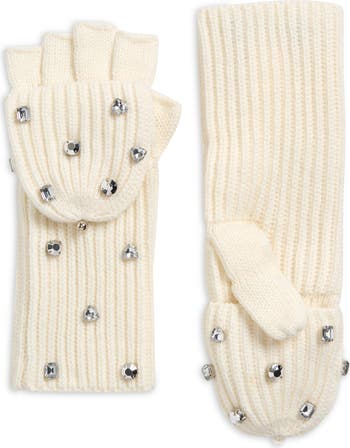 Faceted crystals lend a dazzling touch to these cozy knit fingerless mittens designed with a flip top for extra coverage.
