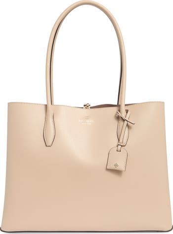 A rich leather exterior adds timeless sophistication to a spacious tote fitted with a divided interior for easy organization.