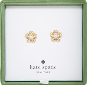 Glossy faux pearls center scalloped petals with sparkly cubic zirconia on these dainty stud earrings that are perfect for any occasion.