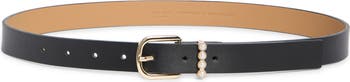 Bring elegance to your look with this sleek leather belt finished with a gleaming rounded buckle and faux pearl keeper.