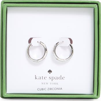 Glittering cubic zirconia embellishments and a high-polish finish dial up the shine of these huggie hoop earrings.