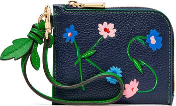 A blossom-tossed card case carries just the essentials whether in your bag or clipped to your wrist with the optional leafy strap.
