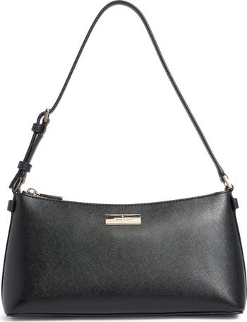 Polished logo hardware brings signature styling to the front of this slightly curved shoulder bag made from textured faux leather.