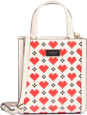 Pixelated hearts bring a retro-inspired gaming aesthetic to this compact tote made from Saffiano-textured leather.