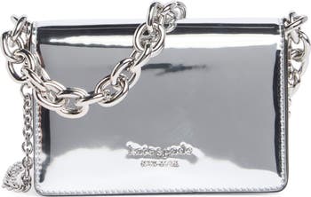 A metallic finish and glossy chain straps bring the glamour to this mini crossbody bag designed in a compact silhouette that's secured by a fold-over flap.