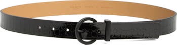 A circle-embossed pattern textures this leather belt finished with a tonal curved buckle.