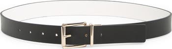 Hearty leather construction defines a reversible belt fitted with a sleek buckle for a bit of shine.