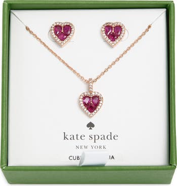 Perfect for gifting or updating your collection, this lovely set features a faceted ruby-hued cubic zirconia heart pendant framed with shimmery pavé with matching stud earrings.