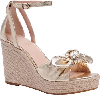 A slim ankle strap and knot detail add plenty of personality to this lofty platform wedge sandal.