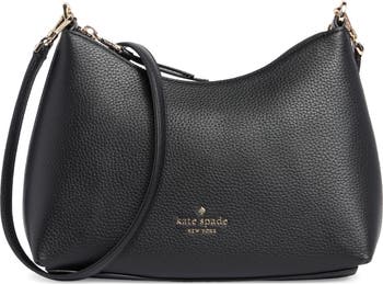 A signature logo plaque highlights the pebbled leather exterior of a slightly curved crossbody bag fitted with a duo of removable straps.