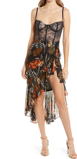 An enchanting cocktail dress showcases a bustier lace top and graceful layers of ruffles down its floral printed skirt for stylish texture.