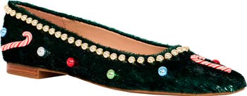 Candy cane and ornament motifs make this shimmery ballet flat a festive addition to your holiday style.