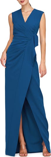 Elegant gathers and a billowy ruffle lend textural interest to this floor-skimming column gown made with generous stretch.