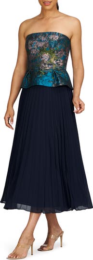 Achieve a two-piece look with elegant ease in an enchanting cocktail dress that reads like a strapless brocade top paired with a frothy chiffon skirt.