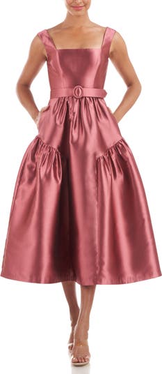Turn heads in this vintage-inspired fit-and-flare dress crafted from glossy satin with a belted waist and handy pockets.