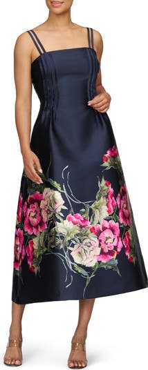 An undone bouquet accentuates the swishy skirt of a toastworthy cocktail dress hung from twinned straps and perfected with a pair of discreet pockets.