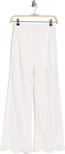 These open‑knit eyelet pants are made from breathable cotton and feature embroidered details with a scalloped hem for an airy finish.