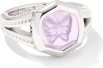 An etched butterfly in lavender opalite enhances the whimsical shine of this hexagonal split-shank ring plated in polished rhodium.