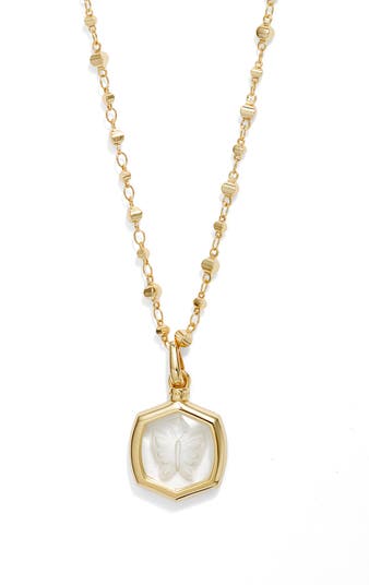 A carved design details the glass pendant of this 14-karat gold-plated necklace that doubles as a bracelet when you remove the extender.