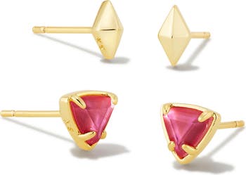 Bring instant shine to your day with this dainty earrings set including polished geometric studs and trillion-cut stone studs plated in warm 14-karat gold.