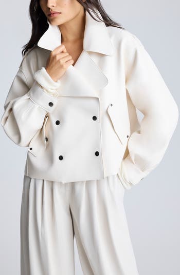 An oyster-inspired hue elevates this faux-leather jacket that features a double-breasted snap front and handsome epaulets.