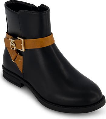 A gleaming buckle adds a fine shine to the contrast strap that frames a kid-favorite boot equipped with a handy side-zip closure for easy-on and off access.