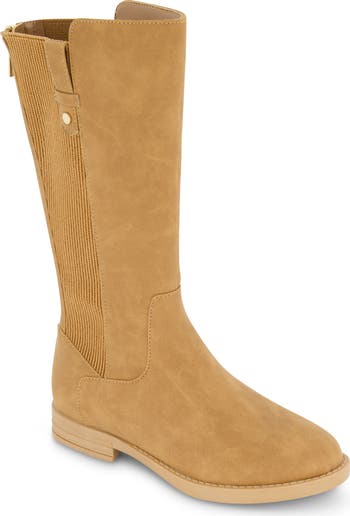 A stretch shaft ensures a snug, stay-put fit to a tall bootie finished with polished hardware for a refined touch.