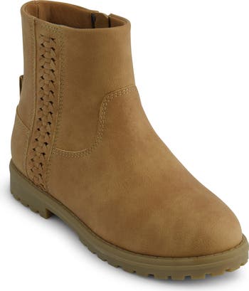 A woven trim adds rustic appeal to a versatile bootie grounded by a traction grip sole.