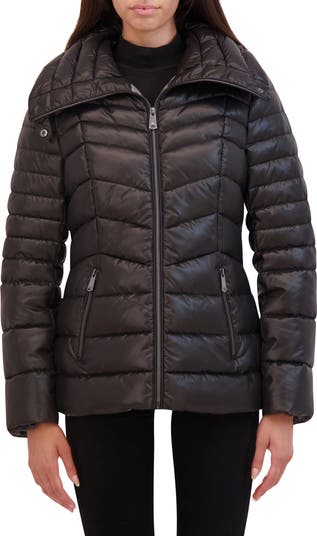A stand collar punctuates this streamlined, chevron-quilted jacket with an extra element of timeless sophistication.