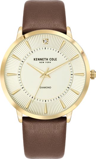 One bright-white diamond distinguishes the 12-o'clock marker on the minimalist dial of a sophisticated timepiece set on a soft leather strap.