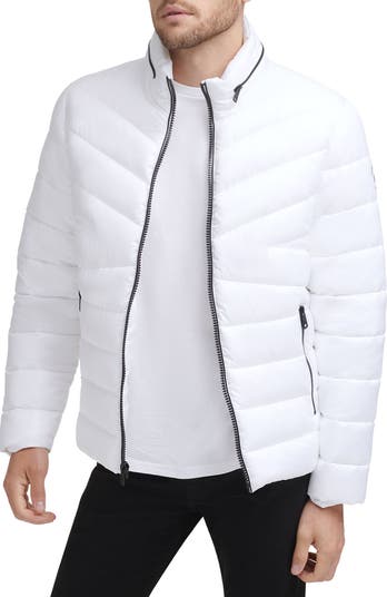 Stay warm in this channel-quilted puffer jacket constructed with a convenient stowaway hood and secure zip pockets.