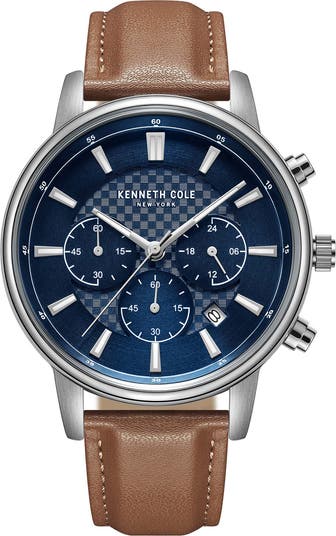 A checkered blue dial brings contemporary style to a sporty chronograph watch secured by a tan leather strap.