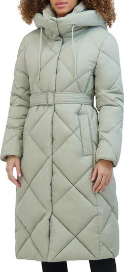 Diamond quilting brings textural interest and warmth to this longline hooded jacket made with toasty insulation.
