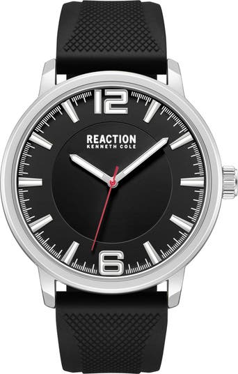 A sporty case and reflective indices complete the sophisticated design of a three-hand watch secured by a perforated silicone strap.