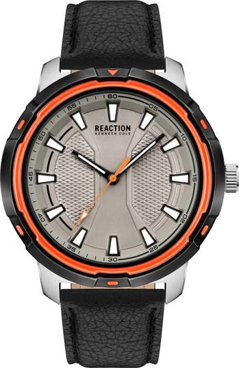 A sporty case and reflective indices complete the sophisticated design of a three-hand watch secured by a faux leather strap.