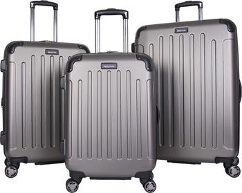 Roadblocks, detours, delays, and layovers. Travel doesn’t always go exactly to plan. However, your luggage should be one thing you can always rely on. Pack all your travel essentials with ease in this Kenneth Cole Reaction 'Renegade' Collection 3-piece lightweight hardside expandable 8-wheel spinner luggage set. 3-Piece set includes a 20-inch carry-on size, a 24-inch checked size, and a 28-inch checked size for versatile packing options. Each piece is loaded with amazing features including a spacious fully lined tear-resistant interior, multiple interior zipper pockets and mesh pockets, a garment restraint panel to hold your clothes in place, two elastic shoe pockets, and even expands an additional 2-inches for additional carrying capacity when needed. Exterior features four molded corner guard reinforcements that provide maximum impact resistance. Features self-repairing coil zippers meant for long lasting use. Boasts a lightweight construction to help you adhere to airline weight restrictions to avoid unneeded airport fees. Features multi-directional 8-wheel spinners that provide smooth 360-degree rotation over any surface allowing you to travel with ease. Features a sturdy and dependable locking retractable push-button telescopic trolley handle that extends 41 inches tall and is conductive for simple one-handed use. Carry-on size designed to meet most U. S. based & international airline carry-on size requirements and to fit into most airline overhead bin compartments. A modern yet traditional luggage set, perfect for travelers whom value both style and function. Backed by a manufacturer’s 10-year limited guarantee against defects.