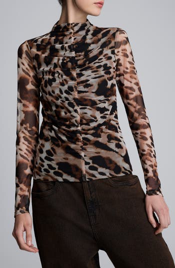 Gathered shoulders and a ruched front gently shape a stretchy mesh top rendered in an abstract print and topped with a funnel neckline.