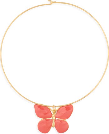 Glossy enamel highlights the whimsical butterfly pendant that anchors this gleaming collar necklace.