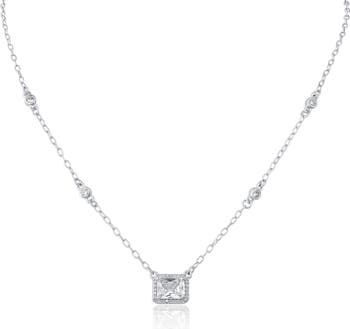 Bezel-set round cubic zirconia shimmer along the chain of an elegant necklace suspending a rectangular cubic zirconia pendant framed by a sparkling halo.