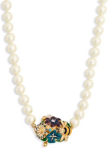 Show off the beauty of nature with this lustrous faux-pearl necklace centered by a vibrant enamel flower- and bee-embellished pendant.