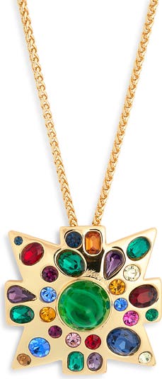 Dress your neckline with the vintage-inspired glamour of a pendant dazzling with an assortment of faux gemstones hanging from a gleaming chain necklace.