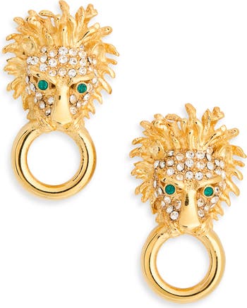 Show off statement shine with these dimensional lion doorknocker stud earrings illuminated by sparkly crystals.