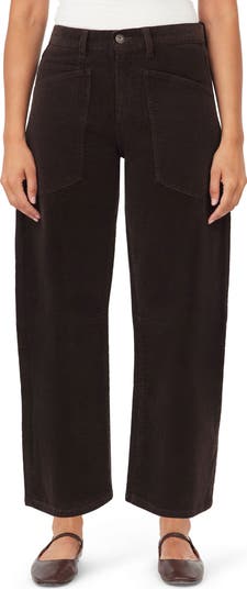 Patch pockets enhance the retro vibe of high-waisted ankle pants cut from stretch-cotton corduroy in a barrel-leg silhouette.